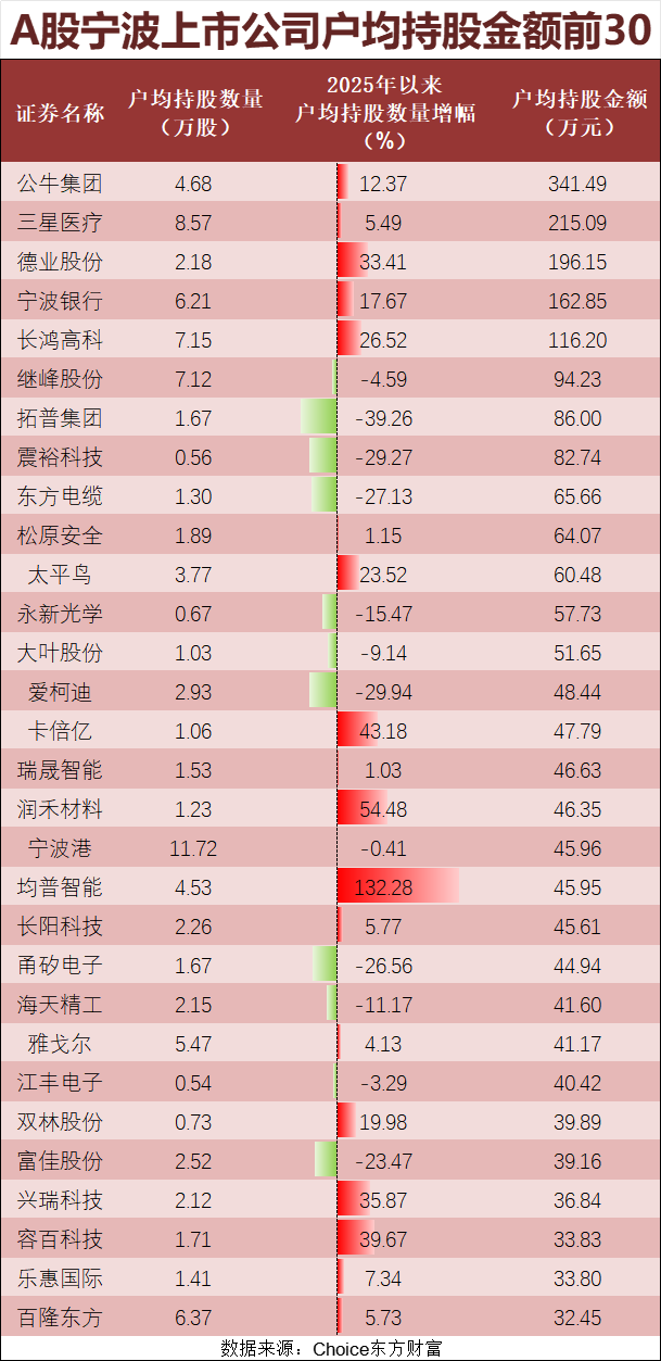 从户均持股数来看,宁波港(11.72万股)、*ST围海(维权)(8.74万股)、三星医疗(8.57万股)居前。今年一季度,比依股份、德昌股份、均普智能、宁波中百等户均持股数翻倍,增幅分别为170.24%、141.17%、132.28%、108.81%。